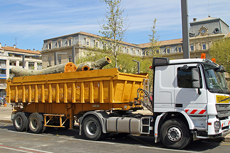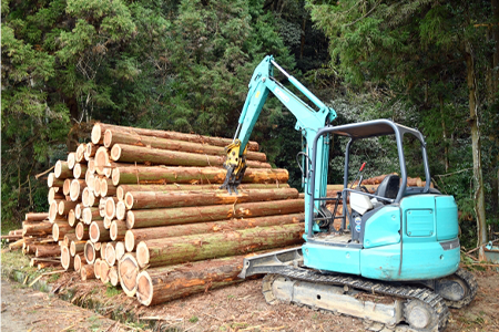 伐採(収穫)した丸太は、ケーブルなどで吊るして山から林道まで運び出されたり、ウインチで引っ張ったりして搬出されます。積みおろし機などで集めてトラックに積み込まれ、原木市場や貯木場へ運ばれます。原木市場や貯木場へ運ばれた木材は競りで製材業者に買われます。また、直接製材工場に運搬される場合もあります。